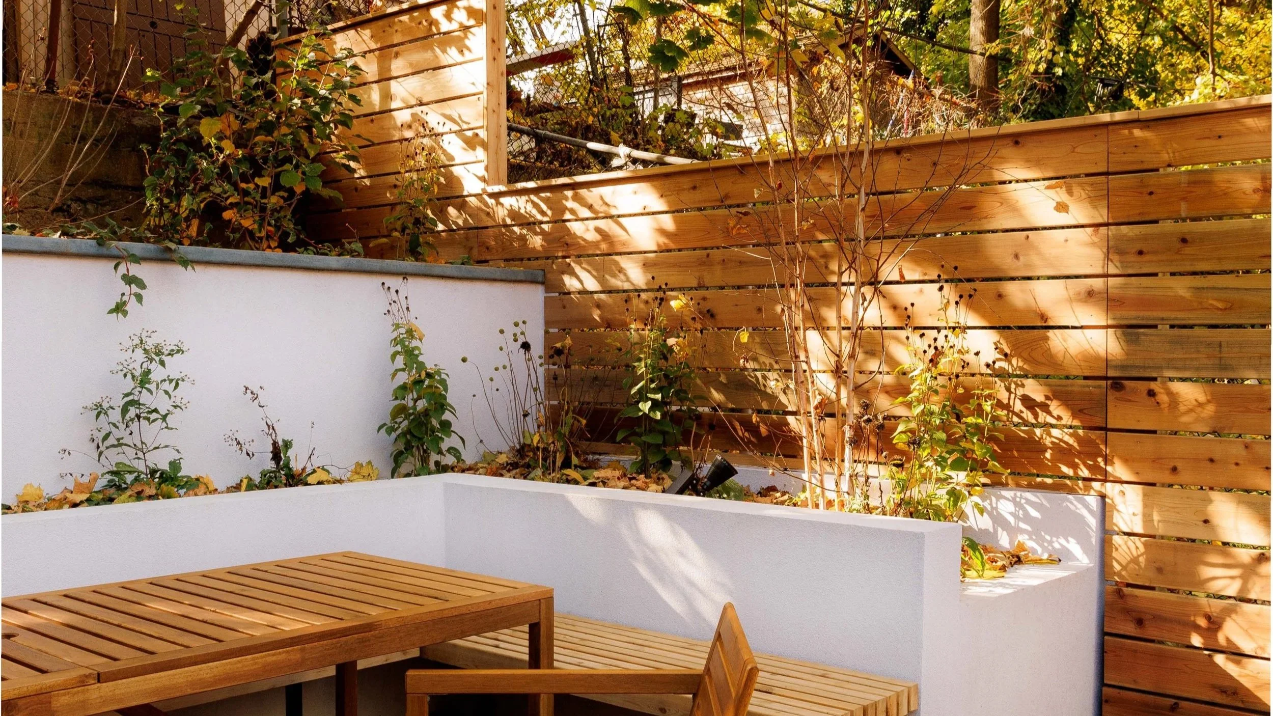 This Brooklyn backyard transformation turns a small backyard lot into a functional, serene garden with a focus on sustainability. The design uses gravel surfaces that naturally absorb stormwater, reducing runoff and replenishing the soil. Beneath the surface, dry wells capture excess rainwater during heavy storms. The use of native plants not only brings vibrant seasonal color but also invites pollinators, providing a localized environment for insects and animals. The garden is divided into two tiers, offering separate areas for each apartment, with the upper level featuring a continuous wooden bench—a gathering spot for dinners and get-togethers. Locally sourced bluestone enhances the natural aesthetic while creating cozy seating areas. The result is a low-maintenance, ecologically conscious garden that blends function, privacy, and beauty