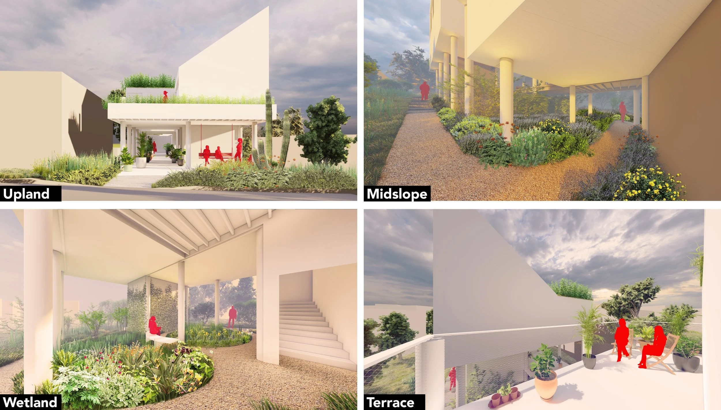Our design leverages the availability of city-owned lots to implement a replicable, distributed, and decentralized stormwater management system, establishing a network of fire-defense nodes across Los Angeles. In our prototype, the residential program is lifted above the landscape, freeing the ground plane to slow and capture stormwater, which is ultimately directed into underground cisterns that store ‘wet powder’ to mitigate fire risk during drought conditions.